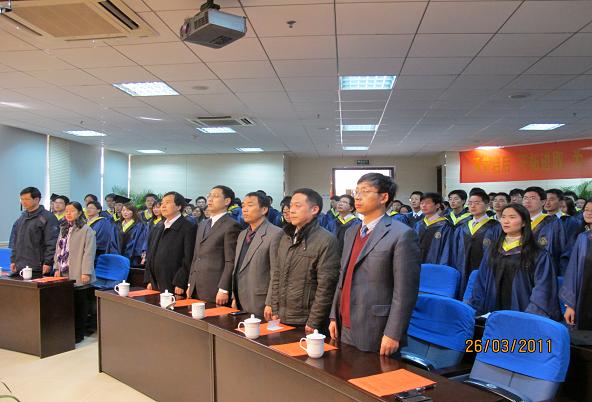 3月26日下午两点,91直播 2011届硕士研究生毕业典礼暨学位授予仪式在南航明故宫校区A12-128隆重举行。出席此次典礼的有学院党委书记王奇峰,常务副院长周建江,副院长刘少斌、赵永久、张弓,党委副书记季海群,此外还有各系主任、导师代表和研究生辅导员。毕业典礼由王奇峰书记主持。