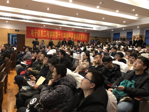 2018年12月19日下午,91直播 第十六期科创基金项目发布会在学院楼515报告厅顺利举行。出席本次发布会的有学院教学副院长张弓老师,电子科学与技术系黄正宇老师,信息与通信工程系夏伟杰老师、戚楠老师、王鹏老师,院团委书记徐艳惠老师,2017级辅导员周高雨老师,以及研究生代表和各年级本科生。