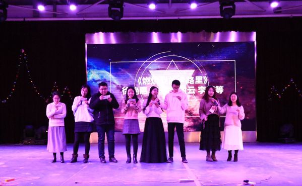 辅导员周高雨和张嘉伟合唱《漂洋过海来看你》。在同学们的呼喊声中晚会高潮不断。最后,辅导员老师徐艳慧、张晓媛、谢云和李萍等合唱《燃烧我的卡路里》,点燃全场。