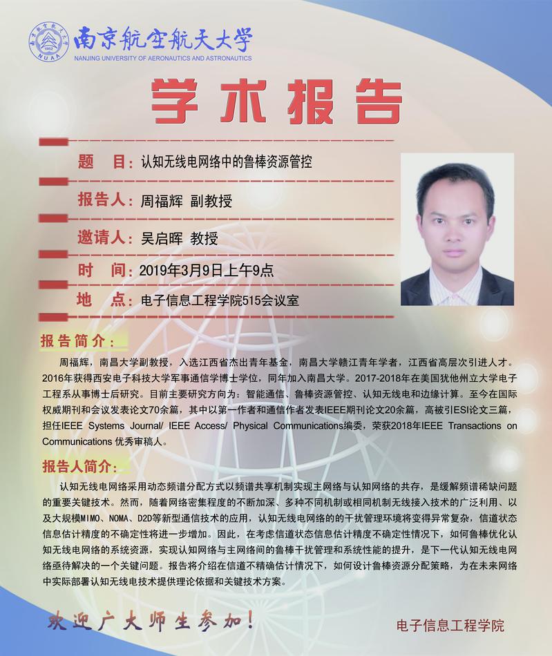 学术报告会——认知无线电网络中的鲁棒资源管控
