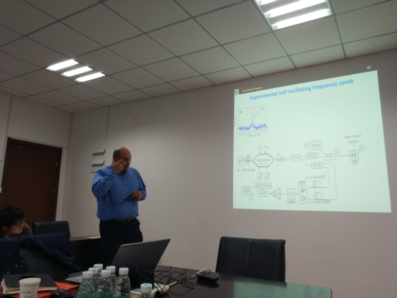 报告中,Stavros Iezekiel教授主要概述了微波光子学的优势和关键应用。重点介绍了基于自振荡光频梳的毫米波和THz信号的光子合成、光电振荡器驱动的光频梳、应用于光载无线中的集成微波光子学以及一些最近应用于电子战中的线性频率网络。报告持续了约两个小时,汇报期间,与会师生积极提问,与Stavros Iezekiel教授进行了充分的交流与讨论。报告结束后,Stavros Iezekiel教授参观了微波光子实验室,并与SPIE协会91直播 分会部分成员共同用餐,交流了最近的研究进展以及可能的合作方向。