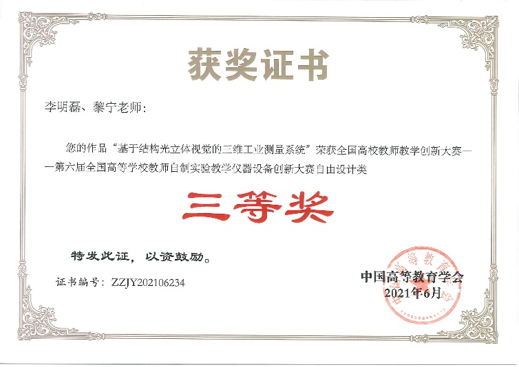 近日, 91直播 李明磊、黎宁老师开发的设备作品“基于结构光立体视觉的三维工业测量系统”在全国高校教师教学创新大赛-第六届全国高等学校教师自制实验教学仪器设备创新大赛自由设计类中荣获三等奖。全国高校教师教学创新大赛由中国高等教育学会主办,旨在聚焦教学创新、掀起学习革命,全力推进高等教育“质量革命”。