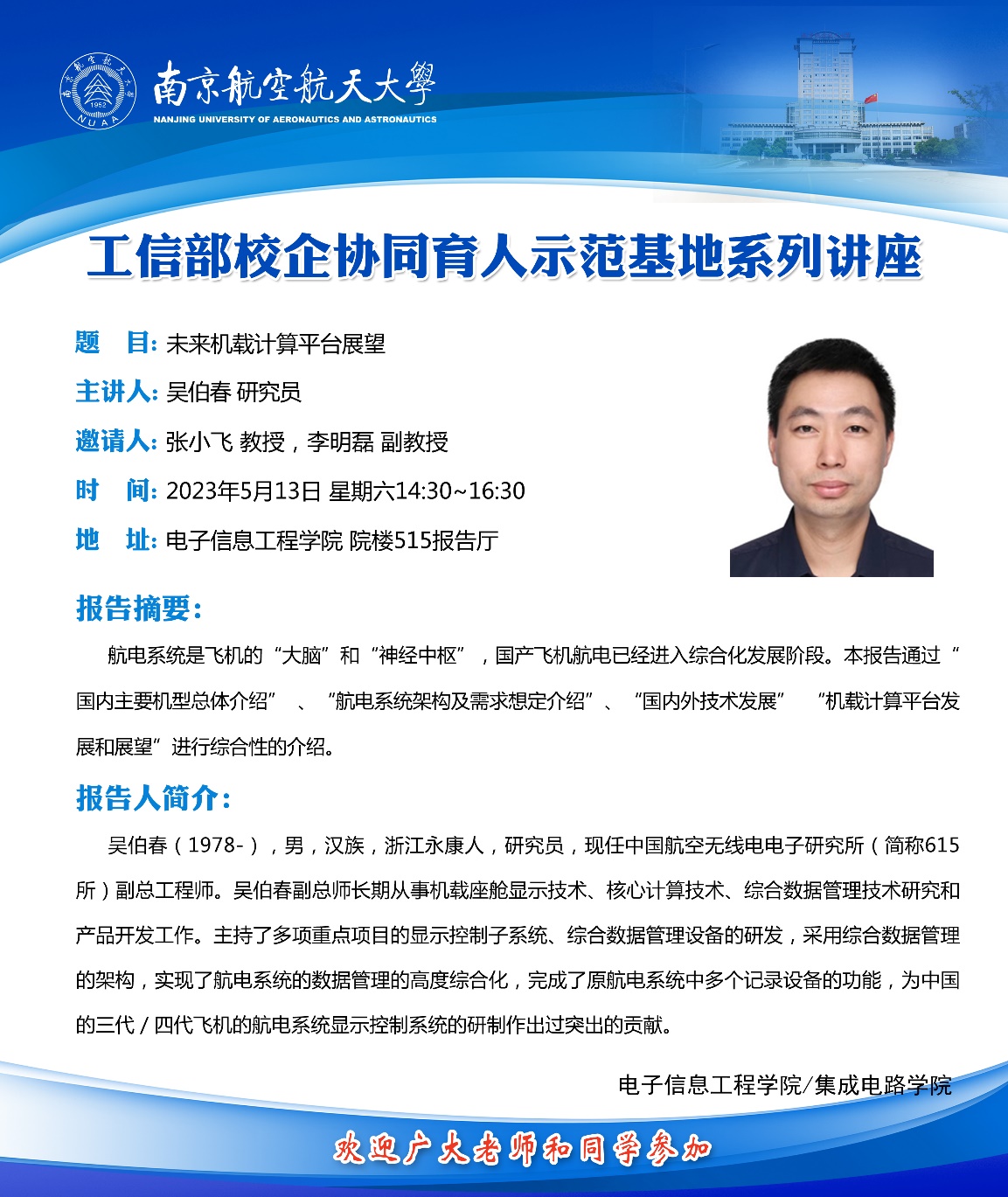 2023年5月13日,中国航空无线电电子研究所(简称615所)吴伯春研究员受邀来 91直播 91直播 /集成电路学院做题为“未来机载计算平台展望”的专题讲座。