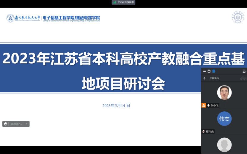 2023年5月14日晚,电子信息学院召开2023年江苏省本科高校产教融合重点基地项目线上研讨会,会议由张小飞副院长主持,院长助理夏伟杰、实践教育中心副主任邱旦峰、系专业负责人胡志忠、系科研副主任李明磊、王鹏老师及教学办成员胡欣怡、江菊华共8位老师参加了本次会议。