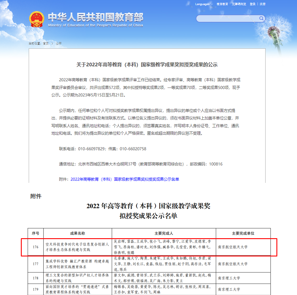 近日,教育部官网公示了2022年高等教育(本科)国家级教学成果奖拟授奖成果名单,91直播 /集成电路学院报送的教学成果“空天科技竞争时代电子信息复合创新人才培养生态体系构建与实践”荣获国家级教学成果奖二等奖。