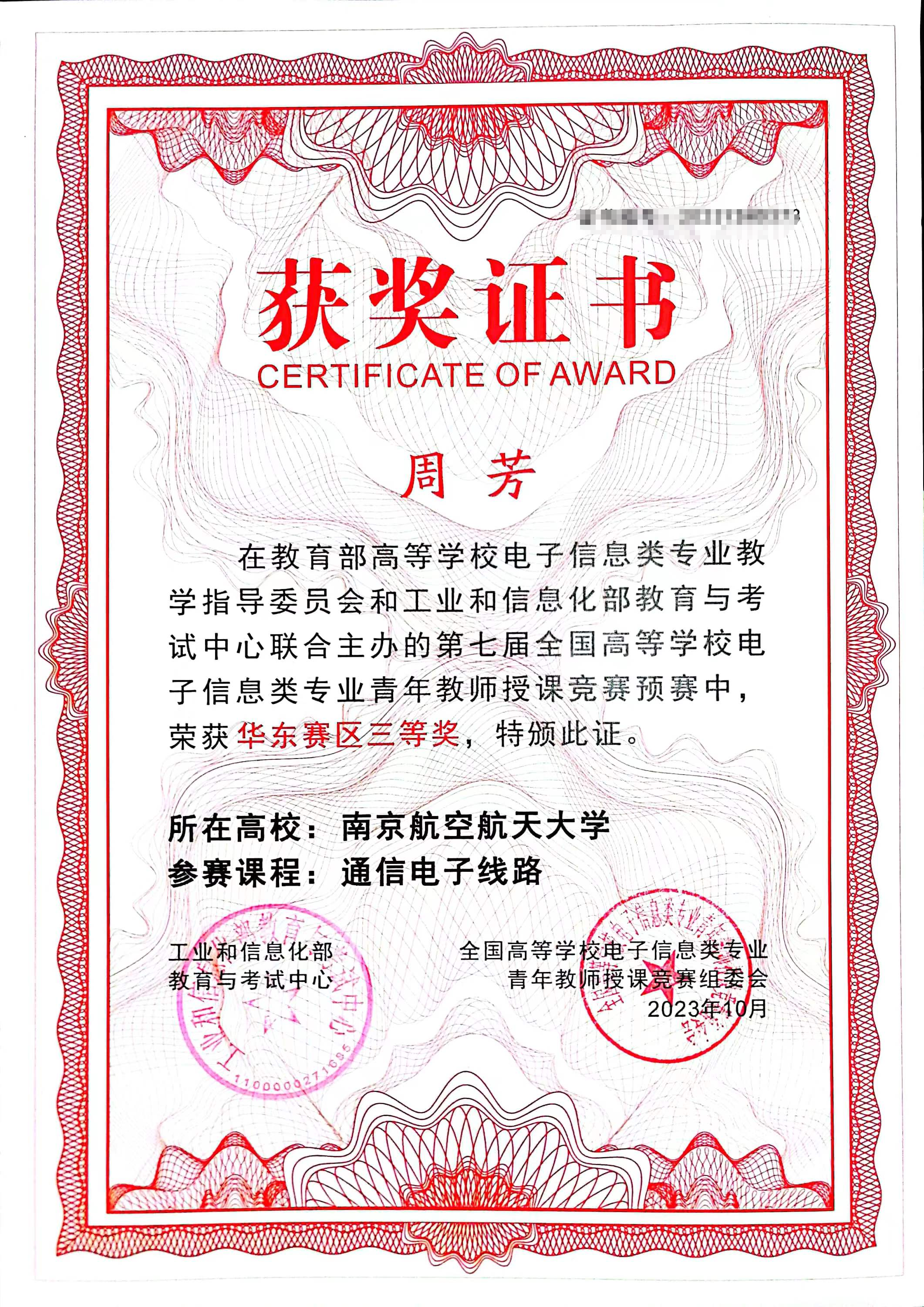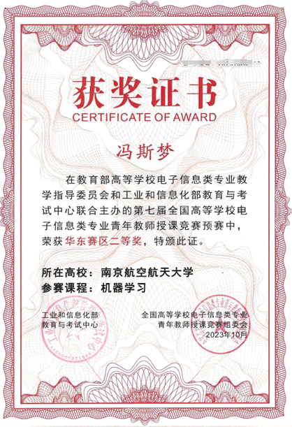 第七届全国高等学校电子信息类专业青年教师授课竞赛于2023年10月22日在桂林电子科技大学顺利结束。 91直播 信息与通信技术系冯斯梦老师主讲课程《机器学习》获华东赛区二等奖,集成电路系周芳老师主讲课程《通信电子线路》获华东赛区三等奖。