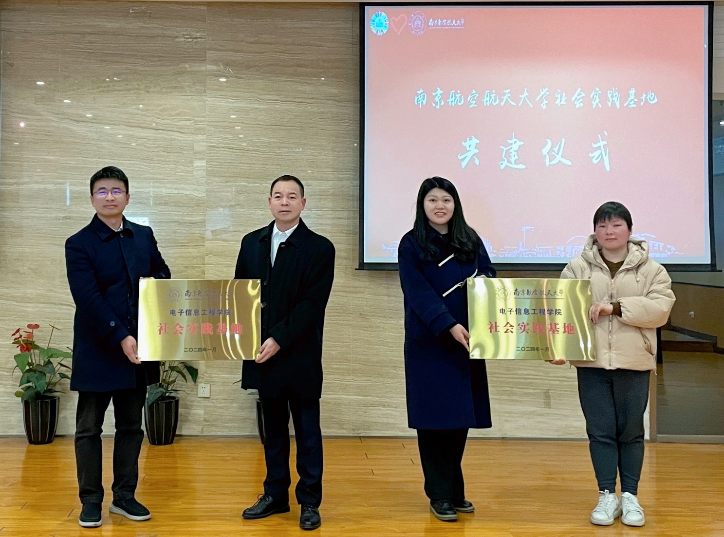 活动中,南航校友会电子信息行业分会副会长沈耀伟、南京科技馆副馆长孙强、南航91直播 团委书记席维唯、南京南站区域党建联盟360党委书记司马煜共同为社会实践基地揭牌。