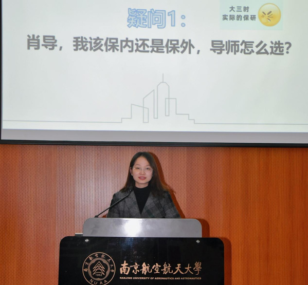 肖紫峰结合往届本科生的毕业去向情况,参照本年级特点,针对性解答不同分数段的学生可能面临的迷茫。她引导同学们在生涯选择的关键节点,综合考量自身兴趣、优势与职业目标,做出科学合理的抉择。此外她还梳理了保研和考研的时间线,分享了实用的资料收集方法,为同学们提供了合理的规划建议。