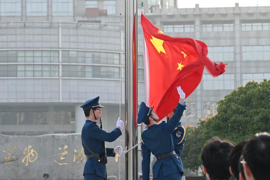 上午7时,国旗班护卫队迈着整齐有力的步伐护送五星红旗入场。伴随着激昂的《义勇军进行曲》,五星红旗冉冉升起,全体人员肃立,行注目礼,奏唱国歌。