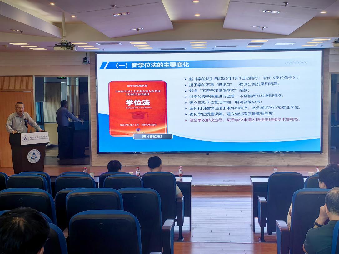 陈兵结合当前教育形势,对《中华人民共和国学位法》修订背景和重点内容进行了系统讲解。他指出,新法在学位授予标准、程序管理、质量监管、争议处理等方面做出多项制度性调整,为高校人才培养质量提升提供了制度保障。围绕法案实施,学校也同步建立了学位论文质量监控与评估体系,推动学位授予过程更加规范、科学。在谈及研究生教育改革实践时,陈兵介绍了学校在招生、培养、导师队伍建设和教育管理等方面的系列举措。包括实施专项计划吸引优质生源、构建分流预警机制、推进国际化联合培养,以及进一步优化学制、论文评审等相关政策,增强人才培养全过程的系统性与规范性。在交流互动环节,参会教师就研究生竞赛、招生等关心问题积极提问,陈兵结合政策导向逐一回答、深入交流,现场气氛热烈。