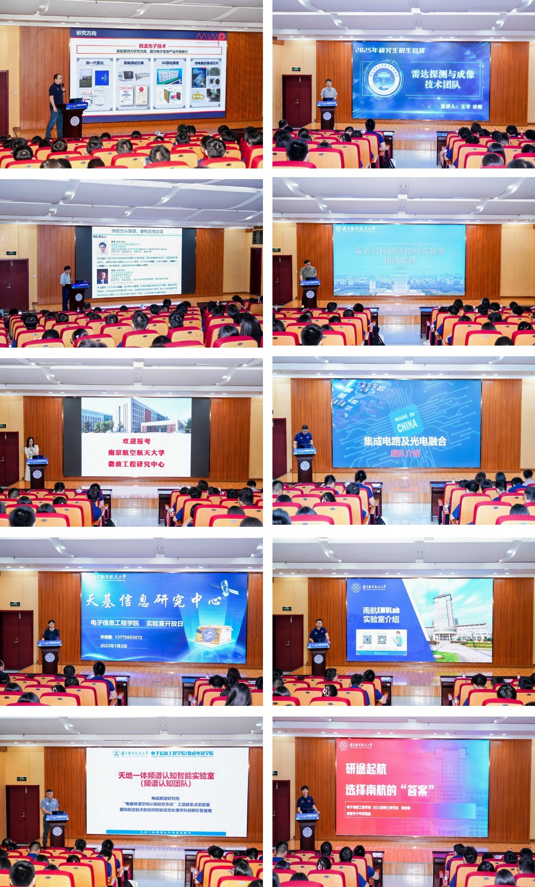 在团队宣讲环节,学院9大科研团队依次进行了专业化、系统性展示。微波光子学团队牛臻弋老师、雷达探测与成像团队王宇老师、多功能光电超材料团队胡昊老师、雷达目标特征控制团队朱凌智老师、微波工程研究中心团队马丽娜老师、集成电路及光电融合团队陈鑫老师、天基信息团队宋晓勤老师、南航EMULab团队孔祥鲲老师和电磁频谱认知团队董超老师等围绕团队特色研究方向、核心技术突破、重大科研项目及人才培养成效进行了专业且详实的讲解。各团队以深厚的学术积淀、前沿的研究成果和广阔的发展前景,充分激发了与会学子对科研创新的浓厚兴趣和学术热情。优秀研究生代表章志健同学以“研途启航—选择南航的答案”为题,结合自身在学院的学习成长经历,分享课程学习、科研实践、学术交流等方面的心得体会,为学弟学妹们提供了宝贵的成长经验。