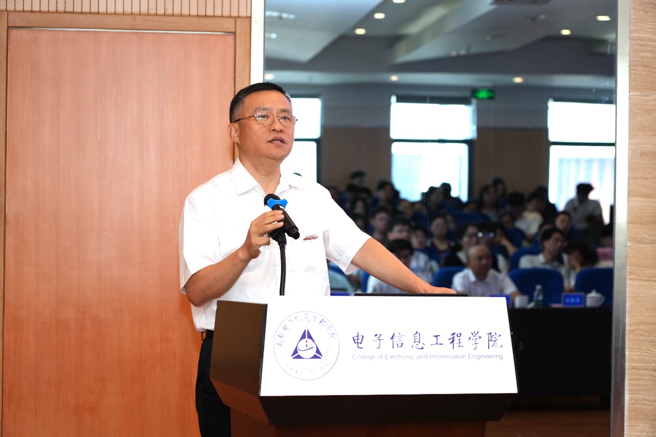 仪式结束后,孙泽洲以“深空探测任务及电子信息技术应用”为题作学术报告。他结合自身主持型号任务的丰富经历,回顾了中国深空探测从月球探测起步,到实现火星“绕、着、巡”三位一体探测的发展历程与突破的技术难题,同时对深空探测作了未来展望。报告中,孙泽洲还深入剖析了电子信息技术在航天器测控数传、数据管理、导航控制等领域的关键应用,强调了电子信息技术应用对航天事业发展的重要支撑作用,为在场师生带来一场兼具前沿视野与实践深度的学术盛宴。