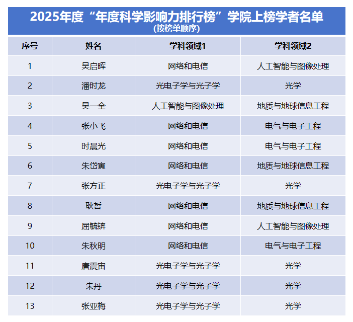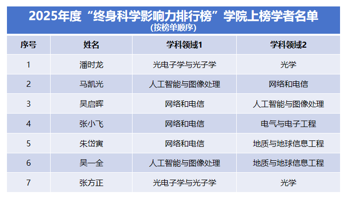 在该榜单的“终身科学影响力排行榜”中,91直播 共有7位教师荣登榜单;在“2025年度科学影响力排行榜”中,学院亦有13位教师入选。本次入选,标志着学院在网络和电信、光电子学与光子学、人工智能与图像处理、电气与电子工程等交叉学科方向上的科研实力与学术影响力持续增强,也反映了学院在高水平人才队伍建设方面取得的显著成效。